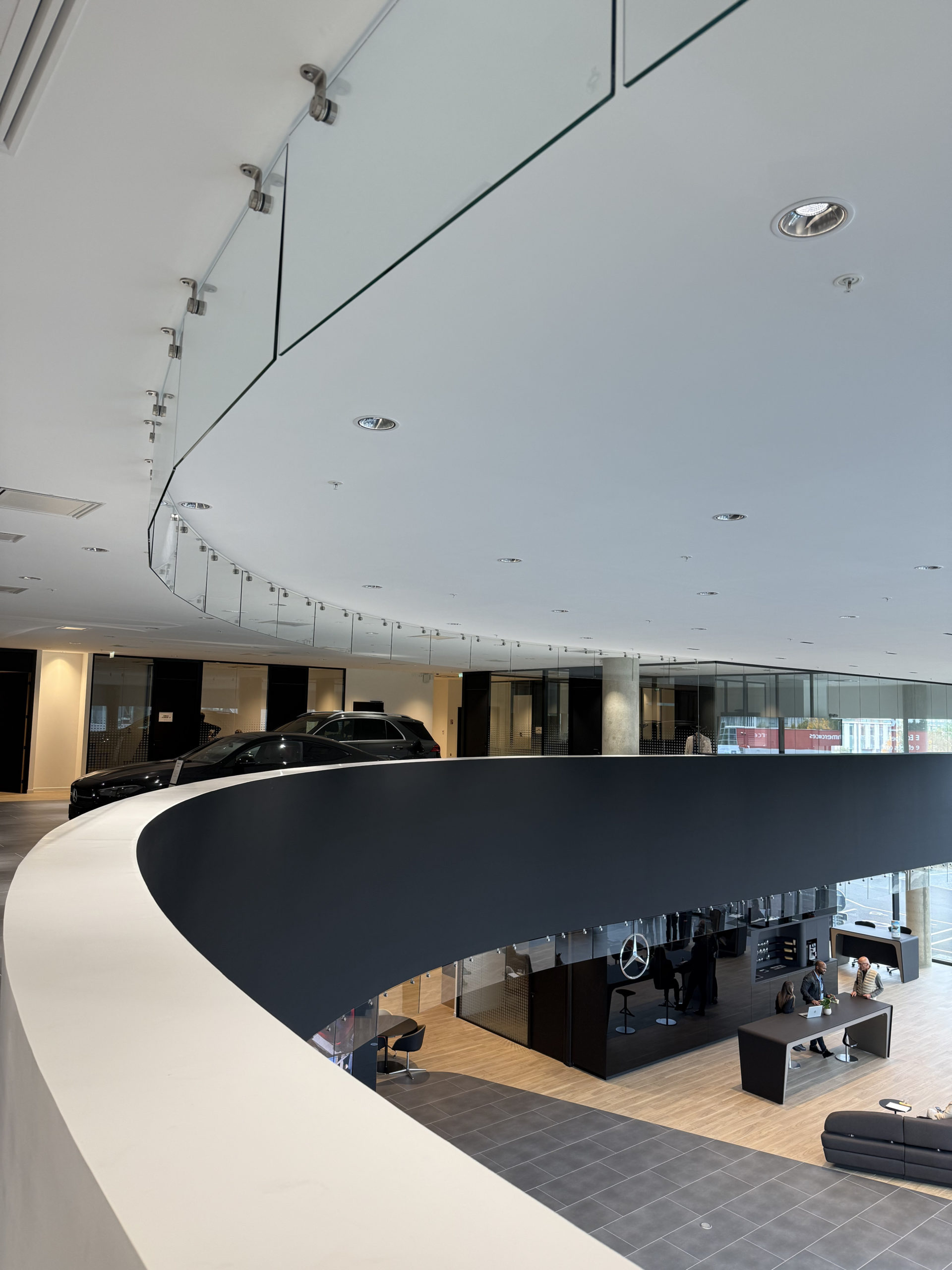 - SWISS LIFE – Lyon (69) – Escalier monumental tournant avec palier droit à noyau central et garde-corps vitré en inox avec marches en inox.
