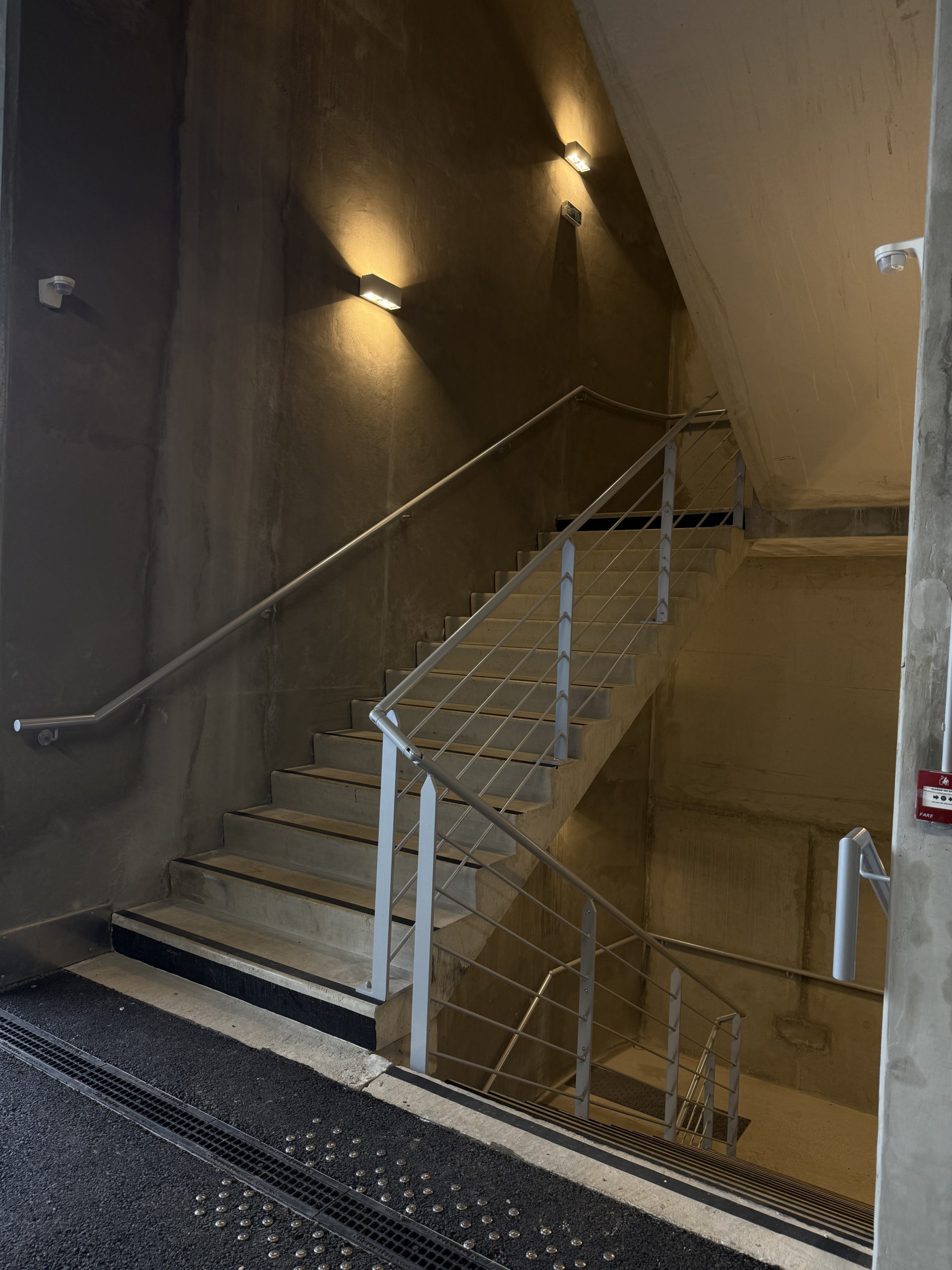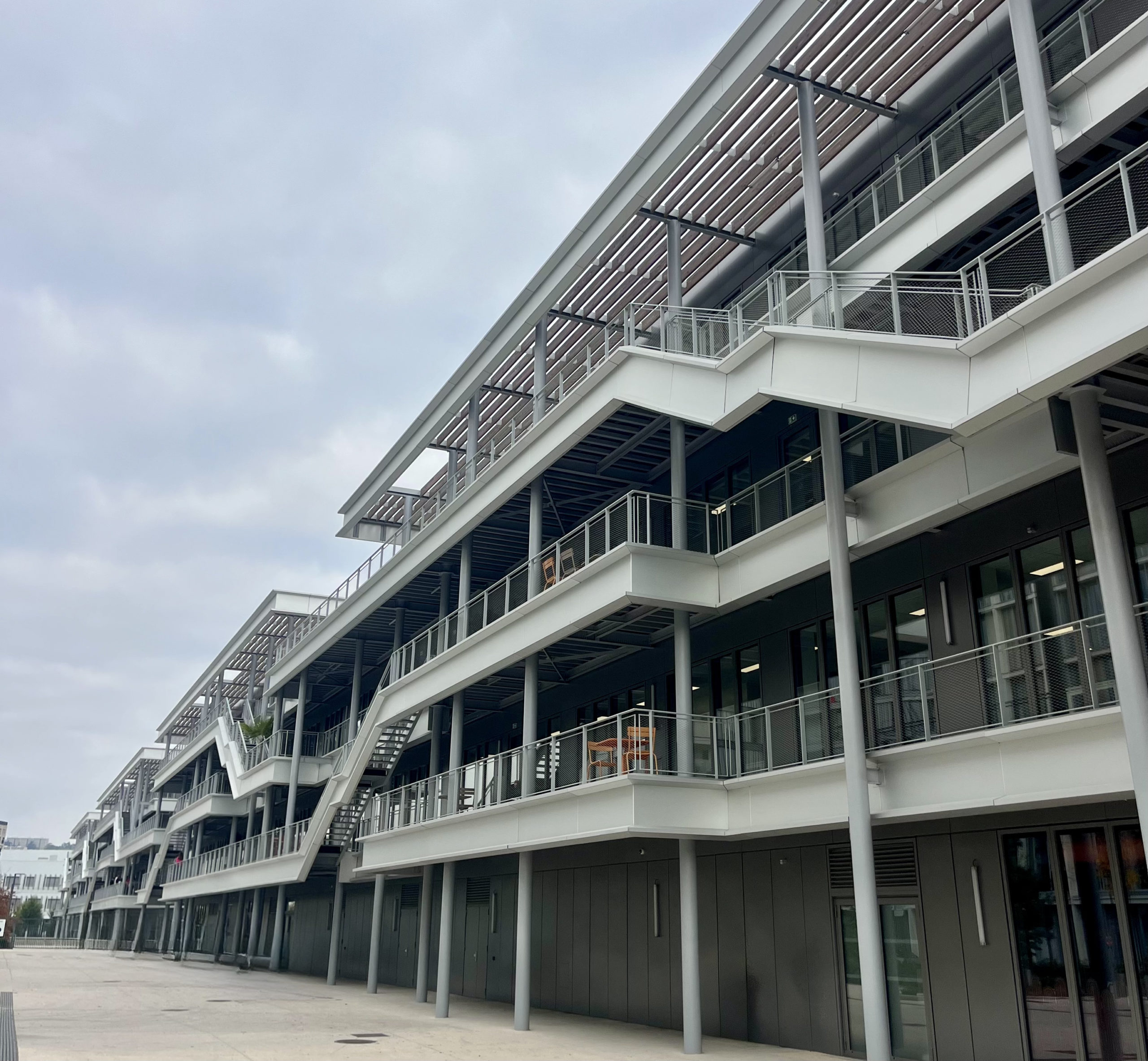 - Pôle de Loisirs Confluence – Lyon (69) – Escaliers droits extérieurs en acier pour évacuation salle de cinéma avec garde-corps droits rampants, escaliers pompiers…